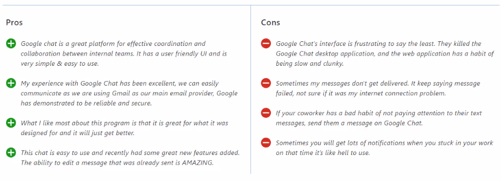 Reviews from Capterra note that Google Chat is easy to use. It also provides good collaboration tools. However, the interface can be frustrating, message delivery can be an issue, and notifications can be challenging to navigate.